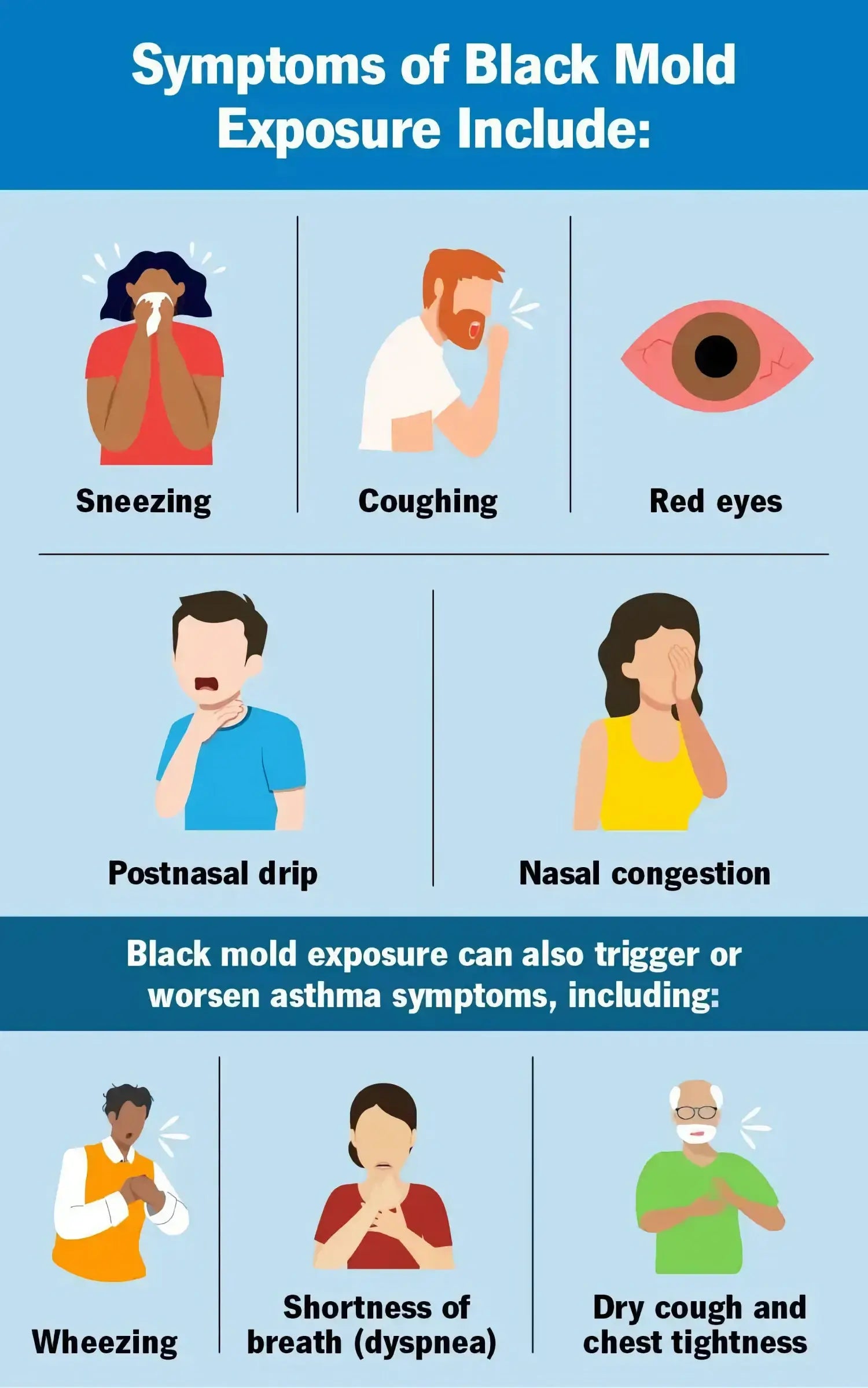Black mold is a fungus that can affect your immune system and cause some bad reactions. It can make you sneeze or cough, it can cause congestion and it can irritate your eyes. While the presence of black mold rarely results in death or serious disease, it can certainly exacerbate the symptoms of asthma.